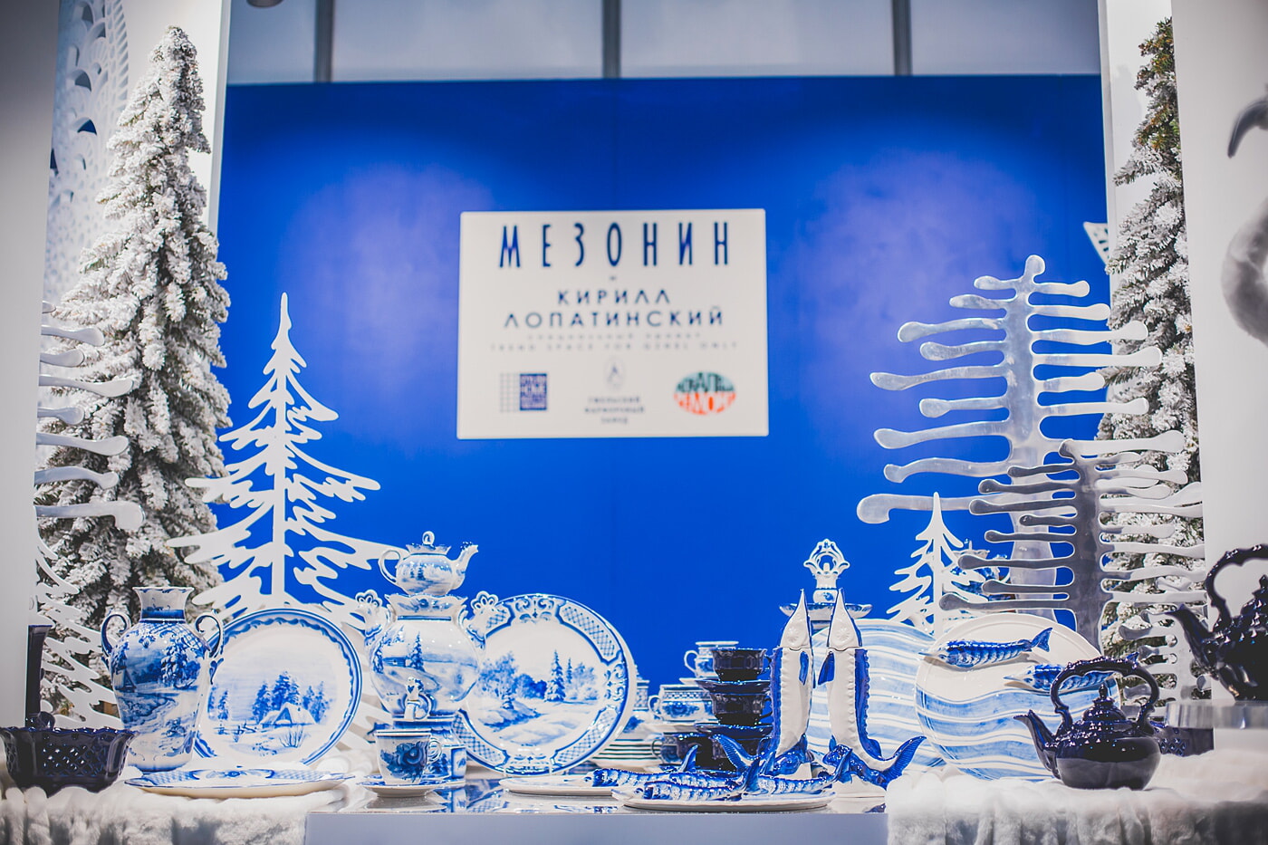 С 13 по 15 сентября в международном выставочном центре «Крокус Экспо» (Москва) состоялась крупнейшая в России 18-я международная специализированная выставка посуды, подарков, товаров для дома и интерьера - HouseHold Expo. Изделия Гжельского фарфорового завода стали главными действующими лицами завораживающей зимней сказки, рассказанной Кириллом Лопатинским посредством незабываемых волшебных декораций на стенде журнала "Мезонин". Мы попытаемся передать в фотографиях атмосферу этого невероятного зрелища, когда воздушные кружева интерьера вплетались в сине-белые пейзажи фарфора, загадочные птицы готовились расправить крылья, а фарфоровые осетры с тарелок Дианы Балашовой оживали и отправлялись в странствие по голубым волнам океана фантазии.