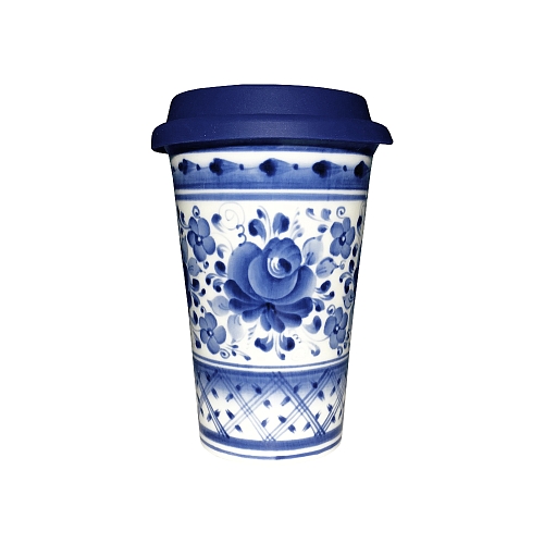 Авторский кофейный стаканчик с силиконовой крышкой №4 объем 400 мл. гжель ручная роспись